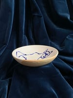 A wheel thrown bowl, hand painted with creature in layers of glazes and underglazes.