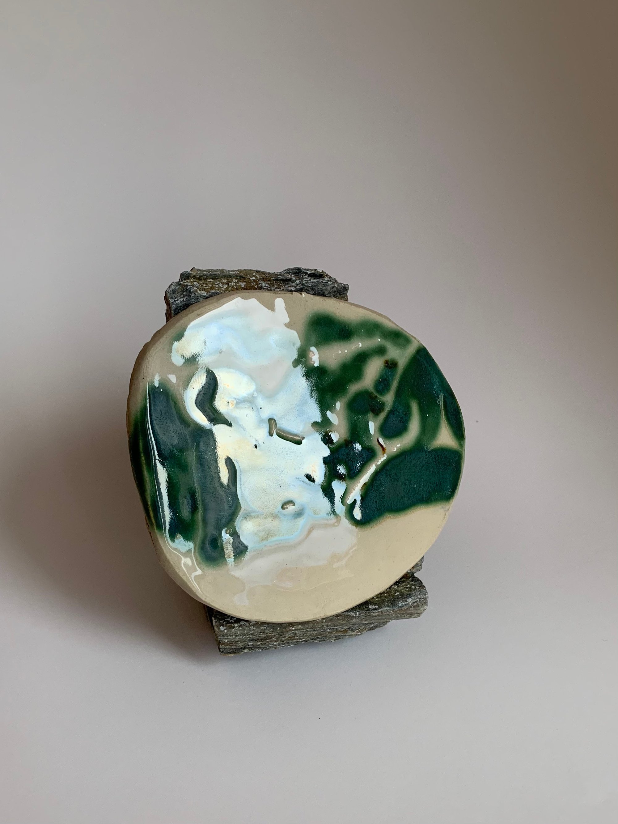A hand built round tile painted with glazes.