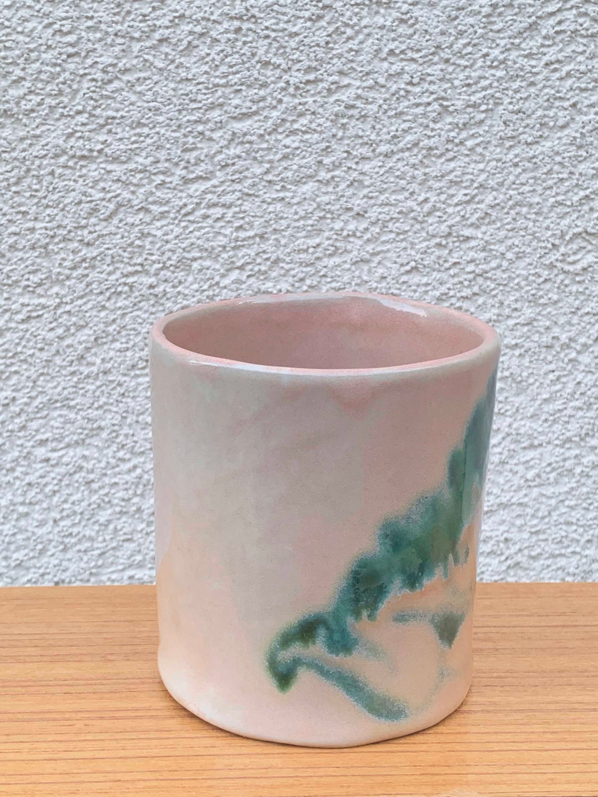 A hand built cup, hand painted in layers of glazes and oxides.