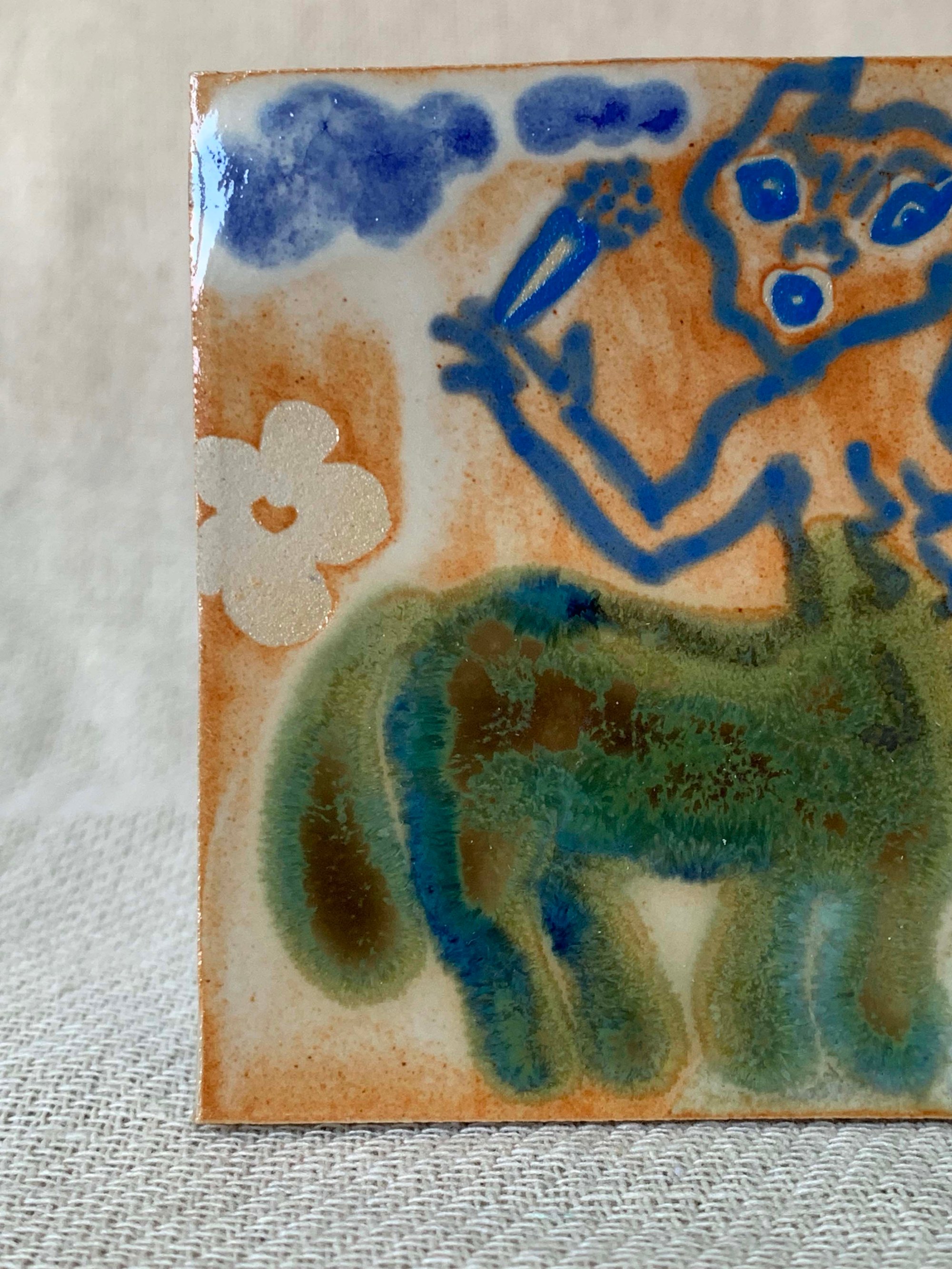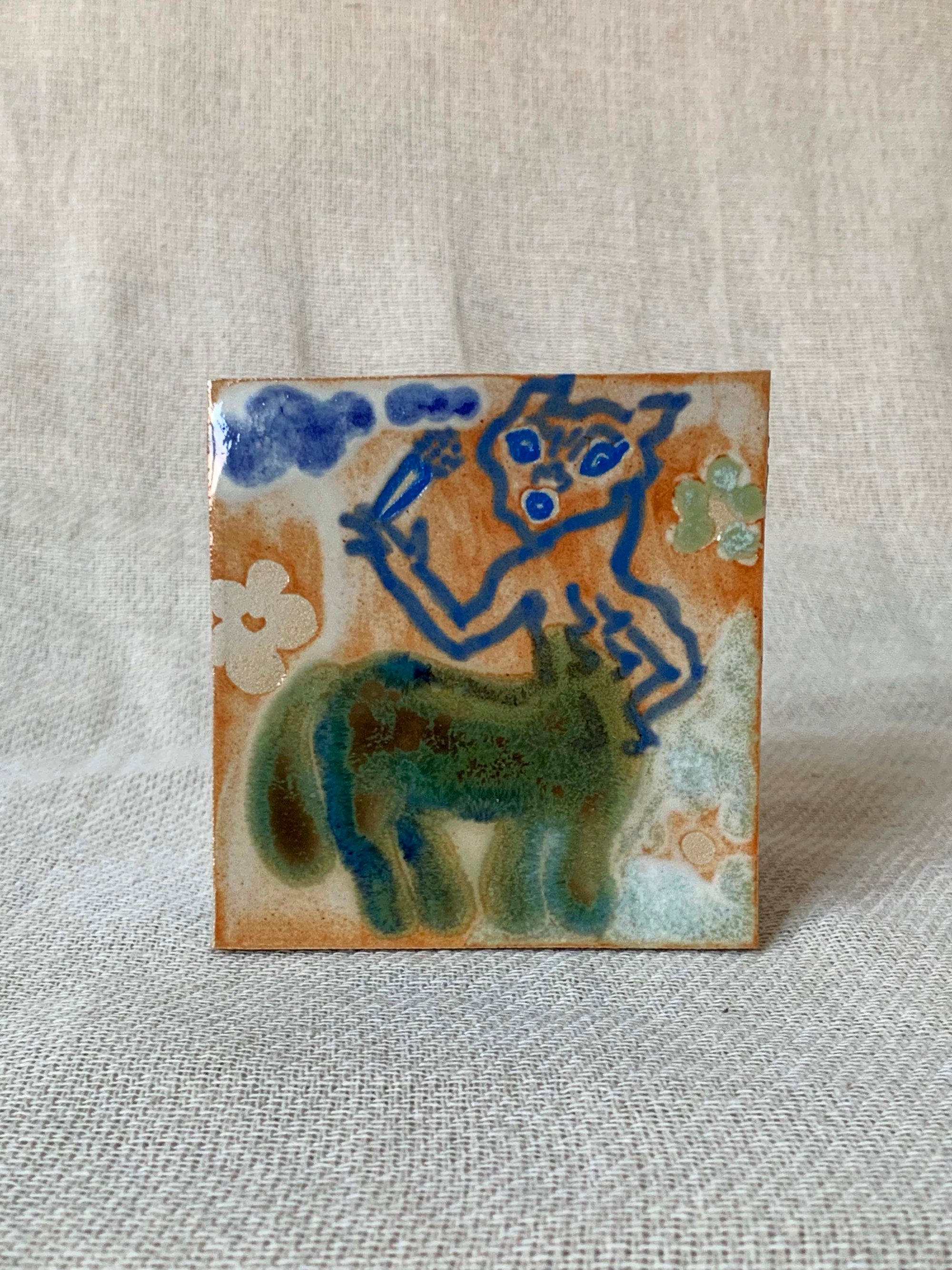 A hand built square tile painted with glazes and underglazes.